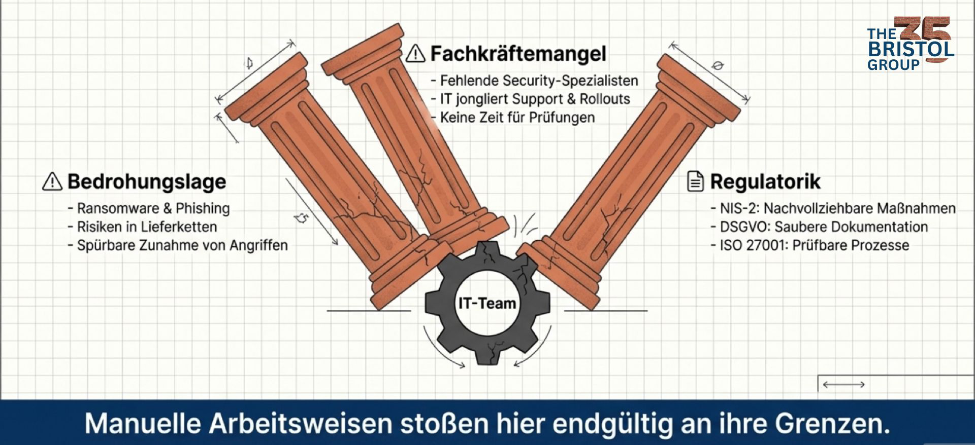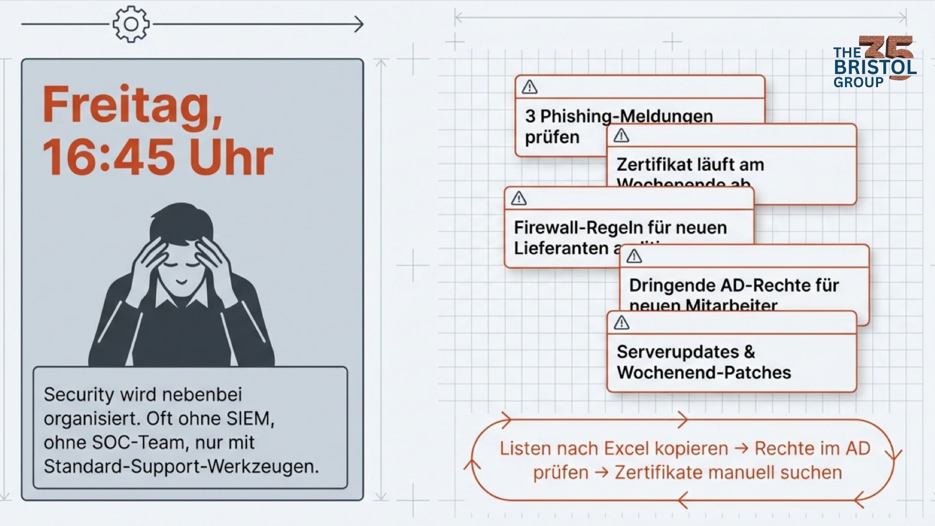 Freitag, 16:45 Uhr. Anna sitzt noch im Büro eines mittelständischen Produktionsunternehmens und öffnet ihre E-Mails. Drei Phishing-Meldungen warten auf eine Bewertung. Ein Zertifikat läuft in wenigen Tagen ab. Die Firewall-Regeln müssen überprüft werden, bevor ein neuer Lieferant angebunden wird. Aus dem Vertrieb kommt eine dringende Anfrage wegen der Zugriffsrechte eines neuen Mitarbeiters, der am nächsten Morgen startet. Gleichzeitig stehen Serverupdates und Wochenend-Patches an.